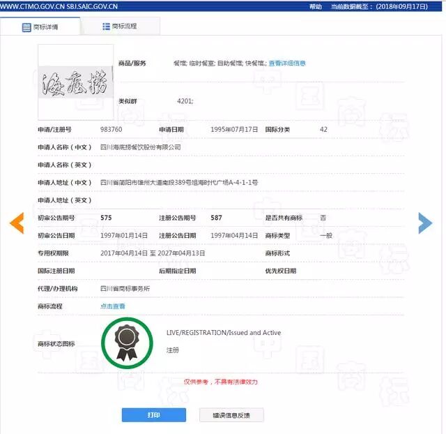 從第一枚商標的申請范圍來看,我們能很明顯的感受到海底撈對品牌的保護,而且一開始就對自己所處行業的商標進行了注冊,很明智。