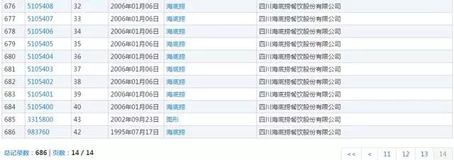 1994年,第一家海底撈在四川省開業; 2018年,海底撈全球店面超300家; 2018年5月,海底撈國際控股在港交所遞交上市申請; 2018年8月30日,海底撈通過港交所聆訊,于9月3日開始PDIE,9月7日定價17.8港元,將于9月27日正式掛牌上市。 截至2017年末,海底撈門店數量達到了273家;2018年計劃開設180家至220家新店,目前海底撈共有餐廳320家,包括位于臺灣、香港及海外新加坡、韓國、日本及美國等地的門店。 據披露,海底撈已經在國內主要中式餐飲品牌中排名第一,以翻臺率、年度收入和年度客流量計算,排名國內五大餐飲品牌之首。2017年客流量超過1.03億人次,在中國內地,每家門店每天平均有近1500人次造訪。 24年的時間,海底撈這個火鍋品牌享譽全國并成功上市,發生在海底撈身上的故事完全可以用“傳奇”來形容了。 從0到1,海底撈能一步步發展到今天,這跟他們的企業品牌建設息息相關。在海底撈正式掛牌上市之前,讓我們從商標方面來看看海底撈的品牌保護做得如何。 在國家商標局官網查詢到的數據顯示,當前在“四川海底撈餐飲股份有限公司”名下檢索到總共686件商標,其中和“海底撈”相關的就有197件,多半都是“海底撈、海底撈HI、海底撈火鍋、海底撈調味料 HI、海底撈外送 HI、”等品牌息息相關的商標。