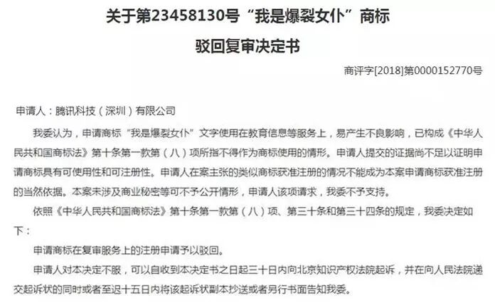 發(fā)表時(shí)間:2019-05-13 10:43 客戶(hù):你們家商標(biāo)注冊(cè)包過(guò)嗎? 小編:商標(biāo)注冊(cè)沒(méi)有包過(guò)這一說(shuō),商標(biāo)..... 客戶(hù): 不能包過(guò)是不是你們實(shí)力不行? 小編:...... 無(wú)論被問(wèn)到多少次,小編的答案都是一致的“商標(biāo)注冊(cè)沒(méi)有100%成功之說(shuō),實(shí)力再?gòu)?qiáng)也做不到......”。 不止是客戶(hù),我們也希望商標(biāo)可以百分之百注冊(cè)成功。但不管你是小企業(yè)還是大企業(yè)都會(huì)遇到商標(biāo)被駁回的煩惱。 比如,騰訊公司申請(qǐng)“我是爆裂女仆”商標(biāo)被駁回,復(fù)審遇失敗;阿里巴巴想申請(qǐng)“阿里小蜜”、“阿里企業(yè)小蜜”、“阿里店小蜜”商標(biāo),結(jié)果同騰訊一樣,因?yàn)椤耙桩a(chǎn)生不良影響”被駁回,復(fù)審再失敗。