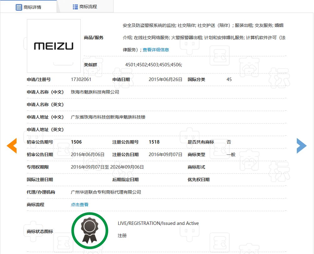 訴爭商標 引證商標 在雙方未能達成一致的情況下,美圖發起了上訴,被告為國家知識產權局,由北京知識產權法院受理,開庭審理時間為2018年12月19日。而經北京知識產權法院判決,駁回美圖訴訟請求,案件受理費100元,由美圖承擔,如不服判決,可上訴至北京市高級人民法院。 附:判決書全文 北京知識產權法院 行 政 判 決 書 (2018)京73行初12187號 原告廈門美圖網科技有限公司,住所地福建省廈門市軟件園二期望海路6號樓302單元。 法定代表人吳澤源,總經理。 委托訴訟代理人崔雯,北京市萬慧達律師事務所律師。 委托訴訟代理人郭婉瑩,北京萬慧達(上海)律師事務所律師。 被告國家知識產權局,住所地北京市海淀區薊門橋西土城路6號。 法定代表人申長雨,局長。 委托訴訟代理人陳卓婭,國家知識產權局審查員。 委托訴訟代理人樊莉,國家知識產權局審查員。 案由:商標駁回復審行政糾紛。 被訴決定:商評字[2018]第0000161177號關于第24043417號“MEITU”商標駁回復審決定。 被訴決定作出時間:2018年9月6日。 本院受理時間:2018年11月29日。 開庭審理時間:2018年12月19日。 原國家工商行政管理總局商標評審委員會以原告申請注冊的第24043417號“MEITU”商標(簡稱訴爭商標)已構成《中華人民共和國商標法》(簡稱《商標法》)第三十條所指情形為由,作出被訴決定,駁回訴爭商標的注冊申請。 原告訴稱:一、訴爭商標與引證商標在含義、呼叫及整體視覺效果方面差異顯著,不構成近似商標,依法應當予以核準注冊。二、訴爭商標與引證商標在其他多類別商品上,有眾多含有“meitu”和“MEIZU”的相關商標已經被核準注冊,且兩商標均能共存于市場中,根據審查一致的原則,應核準訴爭商標的注冊申請。三、原告在國內市場競爭中具有較高知名度,申請商標“meitu”經過原告長期大量使用已經具有較大影響力,消費者已能夠將原告與訴爭商標一一對應,不會導致消費者混淆誤認。綜上,請求法院撤銷被訴決定,判令被告重新作出決定。 被告辯稱:被訴決定認定事實清楚,適用法律正確,作出程序合法,請求判決駁回原告訴訟請求,并判令原告承擔本案訴訟費用。 本院經審理查明: 一、訴爭商標 1.申請人:廈門美圖網科技有限公司。 2.申請號:24043417。 3.申請日期:2017年5月9日。 4.標識: 訴爭商標 5.指定使用服務(第45類,類似群:4502-4503;4505-4506):社交陪伴;社交護送(陪伴);服裝出租;婚姻介紹;計劃和安排婚禮服務;交友服務;在線社交網絡服務;計算機軟件許可(法律服務);域名注冊(法律服務);知識產權許可。 二、引證商標 1.注冊人:珠海市魅族科技有限公司。 2.注冊號:17302061。 3.申請日期:2015年6月26日。 4.專用權期限至2026年9月6日。 5.標識: 引證商標 6.核定使用服務(第45類,類似群:4501-4503;4505-4506):安全及防盜警報系統的監控;社交陪伴;社交護送(陪伴);服裝出租;交友服務;婚姻介紹;在線社交網絡服務;火警報警器出租;計劃和安排婚禮服務;計算機軟件許可(法律服務)。 三、其他事實 另查,根據中央機構改革部署,原國家工商行政管理總局商標評審委員會的相關職責由國家知識產權局統一行使。 庭審中,原告對訴爭商標指定使用的服務和引證商標核定使用的服務構成類似服務沒有異議。 上述事實,有被訴決定、訴爭商標檔案和引證商標檔案、駁回通知書、駁回商標注冊申請復審申請書、原告在復審程序中向被告提交的相關材料等證據材料及當事人陳述在案佐證。 本院認為: 鑒于原告對被告作出被訴決定的程序不持異議,本院經審查予以確認。經雙方當事人確認,本案的爭議焦點在于訴爭商標的注冊申請是否構成《商標法》第三十條所規定之情形。 《商標法》第三十條規定:“申請注冊的商標,凡不符合本法有關規定或者同他人在同一種商品或者類似商品上已經注冊的或者初步審定的商標相同或者近似的,由商標局駁回申請,不予公告”。 商標近似是指商標文字的字形、讀音、含義或者圖形的構圖及顏色,或者其各要素組合后的整體結構相似,或者其立體形狀、顏色組合近似,易使相關公眾對商品或服務的來源產生誤認或者認為其來源與注冊商標的商品或服務有特定的聯系。 本案中,訴爭商標為純文字商標“meitu”,引證商標為純文字商標“MEIZU”。訴爭商標與引證商標在字母構成、呼叫發音等方面相近,僅在個別字母和字母大小寫方面存在不同,整體上不存在顯著差異,容易造成相關公眾混淆誤認,故訴爭商標與引證商標構成近似商標。 類似服務是指在目的、內容、方式、對象等方面相同,或者相關公眾一般認為其存在特定聯系、容易造成混淆的服務。 構成類似服務應當以是否導致相關公眾產生混淆誤認作為判斷標準。本案中,訴爭商標指定使用的“社交陪伴;社交護送(陪伴);服裝出租;婚姻介紹;計劃和安排婚禮服務;交友服務;在線社交網絡服務;計算機軟件許可(法律服務);域名注冊(法律服務);知識產權許可”服務與引證商標核定使用的“社交陪伴;服裝出租;交友服務;計劃和安排婚禮服務;計算機軟件許可(法律服務)”等服務在《類似商品和服務區分表》中屬于類似服務。另外,訴爭商標指定使用的上述服務與引證商標核定使用的上述服務在服務的目的、內容、方式、對象等方面相近,故構成類似服務。對此,原告亦明確表示認可。因此,若將訴爭商標與引證商標同時使用在同一種或類似服